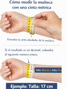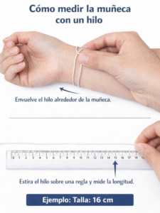 | Guia de talla | Cómo medir tu muñeca: • Con cinta métrica: Rodea tu muñeca sin apretar y anota los cm. • Con cordón o hilo: Rodea tu muñeca, marca donde se cruza, estíralo sobre una regla y mide en cm. Tallas: 15 cm – Muñeca pequeña 16 cm – Muñeca regular 17 cm – Medida más común 18 cm – Muñeca grande 20 cm – Extra grande Recomendación Lunari18k: Si estás entre dos tallas, elige la mayor para mayor comodidad. |