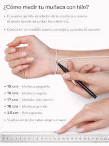 • Con cordón o hilo: Rodea tu muñeca, marca donde se cruza, estíralo sobre una regla y mide en cm.